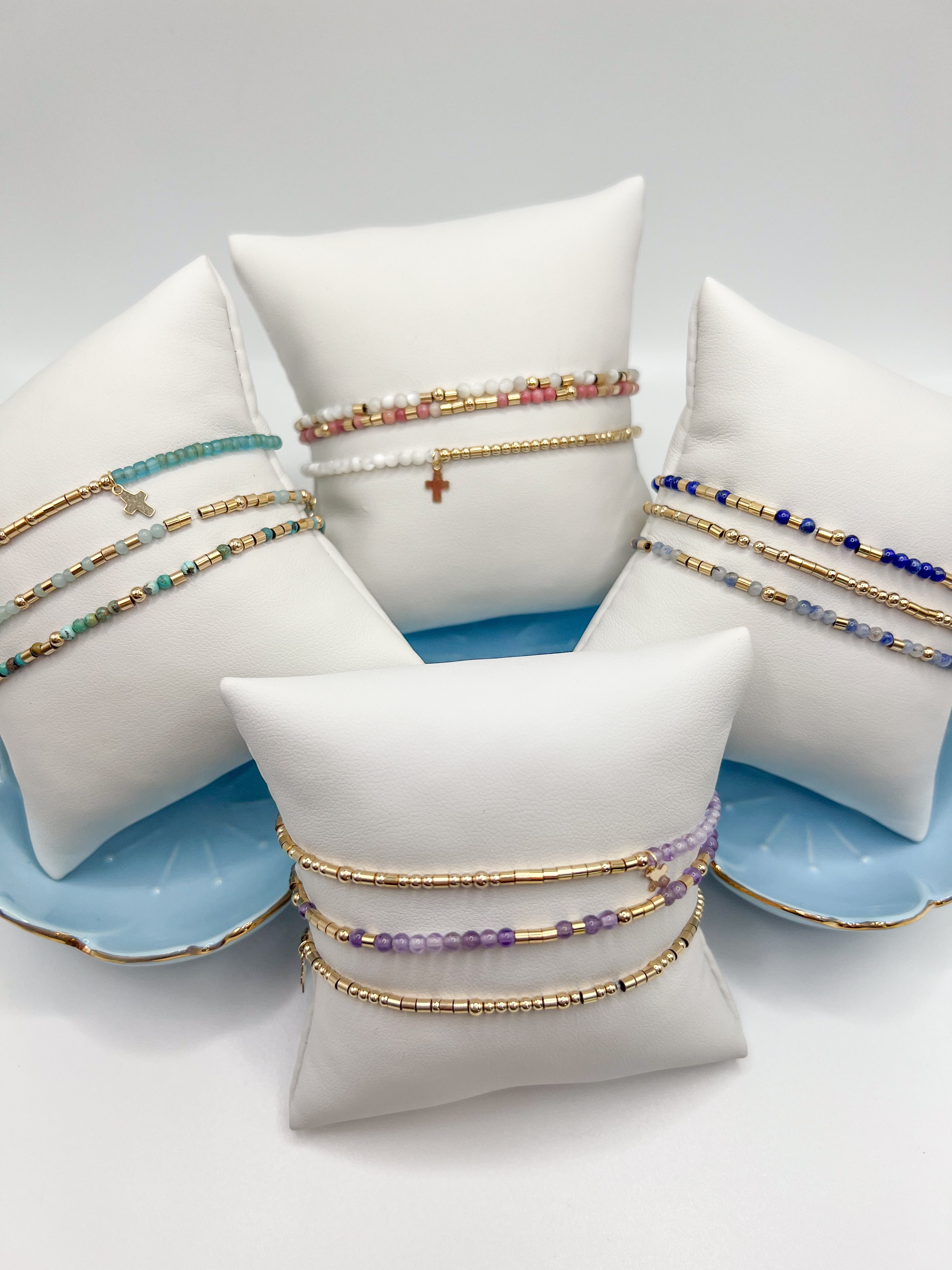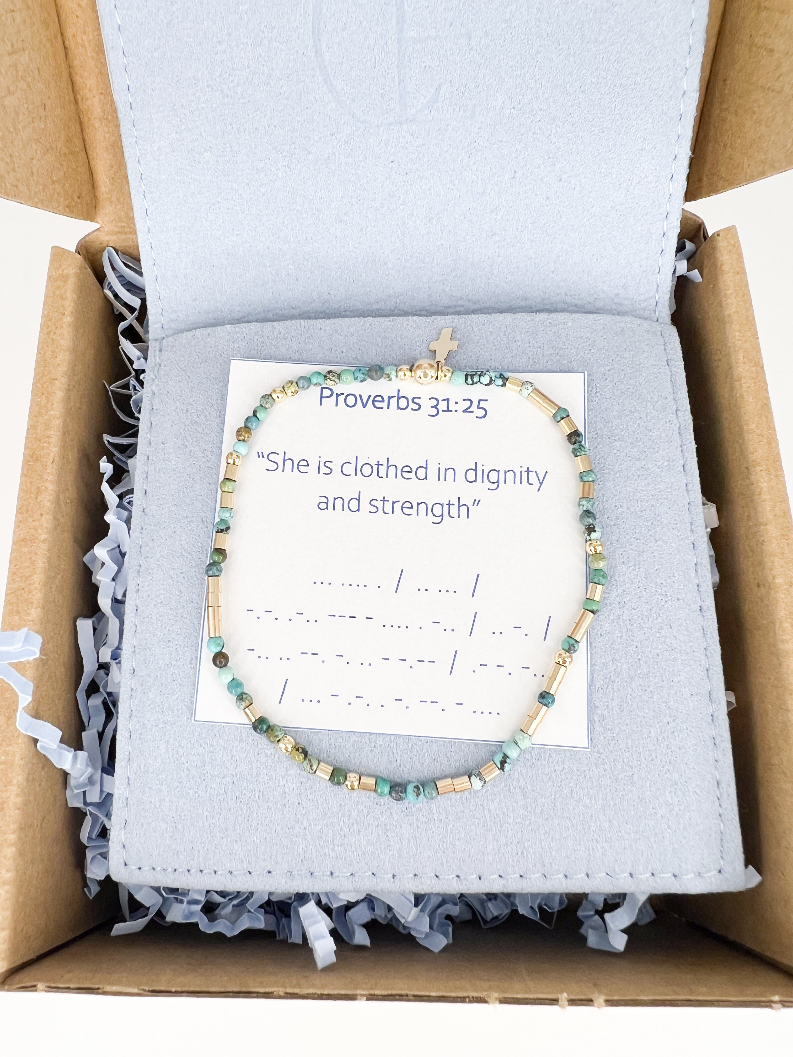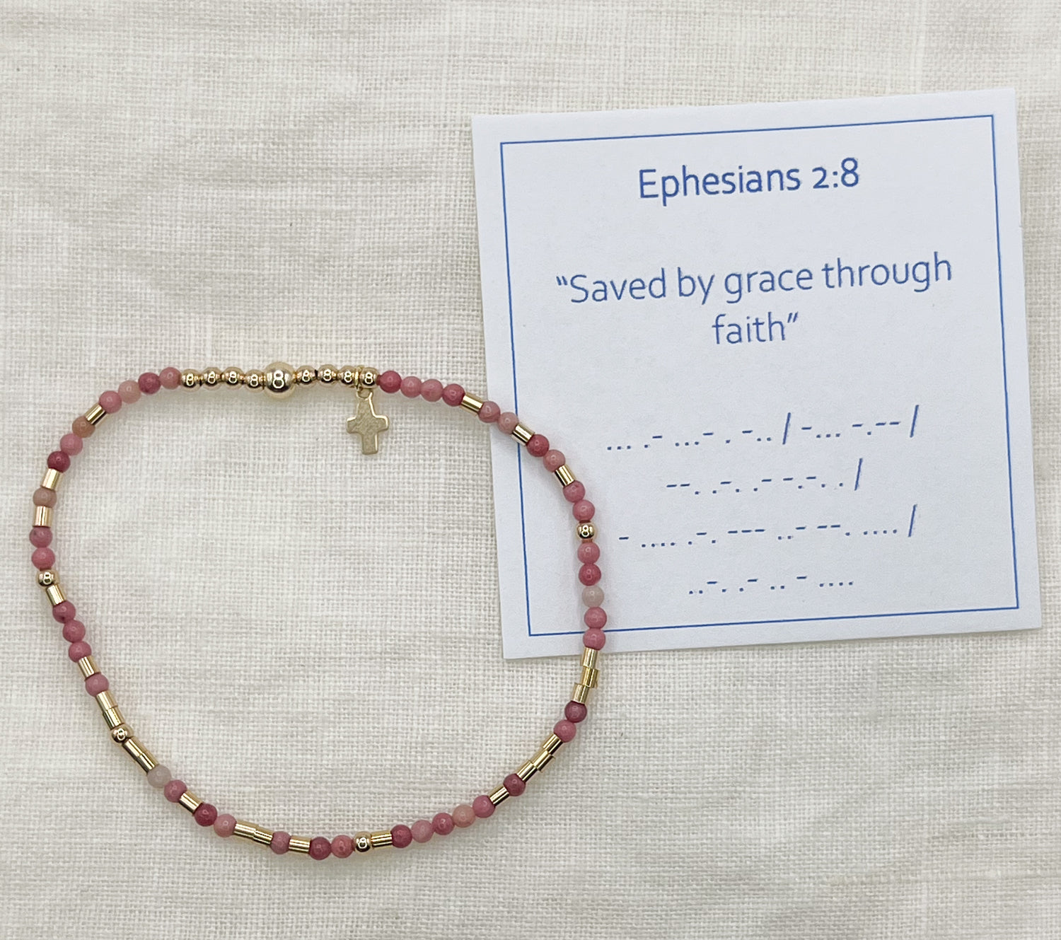 Introducing our exclusive Stack The Word Morse code scripture collection, a unique fusion of Cali Elizabeth’s passion for scripture and her love for all things elegant and shimmering. Embrace the living Word of God wherever you go! When someone admires your bracelets, you can proudly respond, “Thank you, it’s scripture.” It’s a wonderful way to weave Jesus into every conversation.